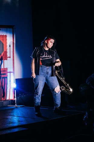 Beth as Frank in the wings, while Hayley, Elliot, and Emilee enjoy Sasha literally giving their all on that sax solo at KAOS @ The Frida Cinema